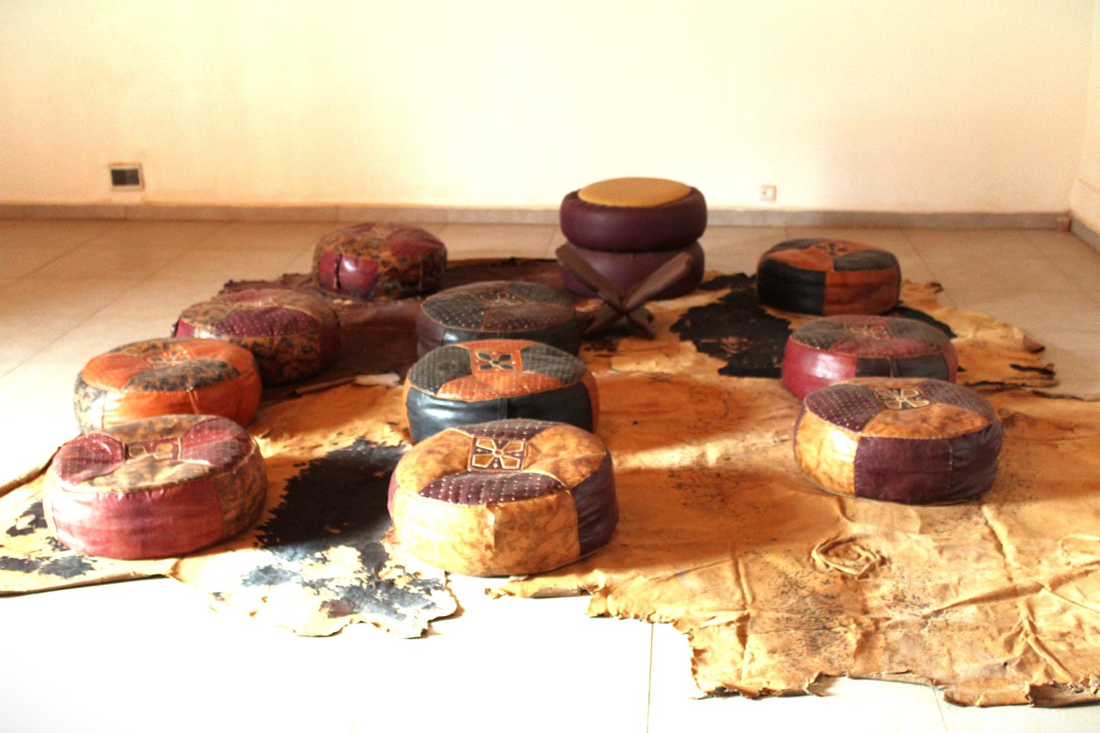 Parmi les médiums artistiques les plus parlantes figure une installation qui se rapporte à la « tente touareg », une proposition artistique émanant des curateurs. L’œuvre se compose d’éléments que l’on retrouve généralement à l’intérieur de la tente. Il s’agit notamment de sièges massifs arrondis, près du sol, ainsi que de tapis en cuir disposés de manière à donner l’illusion d’une concertation. Selon la documentation officielle sur le centre, elle est spécifique au Nord Mali et constitue un symbole de mobilité, de convivialité, mais également de partage d’expériences et de bonnes pratiques. La « tente touareg » est également un espace de promotion de diversité culturelle, de brassage, de vivre ensemble et de cohésion sociale. C’est une œuvre qui dispose d’une place de choix dans cette exposition car elle renferme tout un art de vivre malien. En effet, c’est en ce lieu que les communautés se réunissent pour donner forme à un regroupement informel désigné par le terme « Grin ». Un prétexte de réunion pour des personnes de même classe d’âge qui se réunissent pour la cérémonie de thé. Le thé est le symbole d’un espace de dialogue, de communion mais aussi d’apprentissage et de distraction dans la société malienne*.